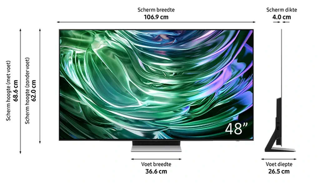 Met de Samsung QE48S94DAEXXN haal je een hoogwaardige 48″ OLED 4K Smart TV in huis, perfect voor wie grootse beeldkwaliteit wil in een relatief compact formaat.